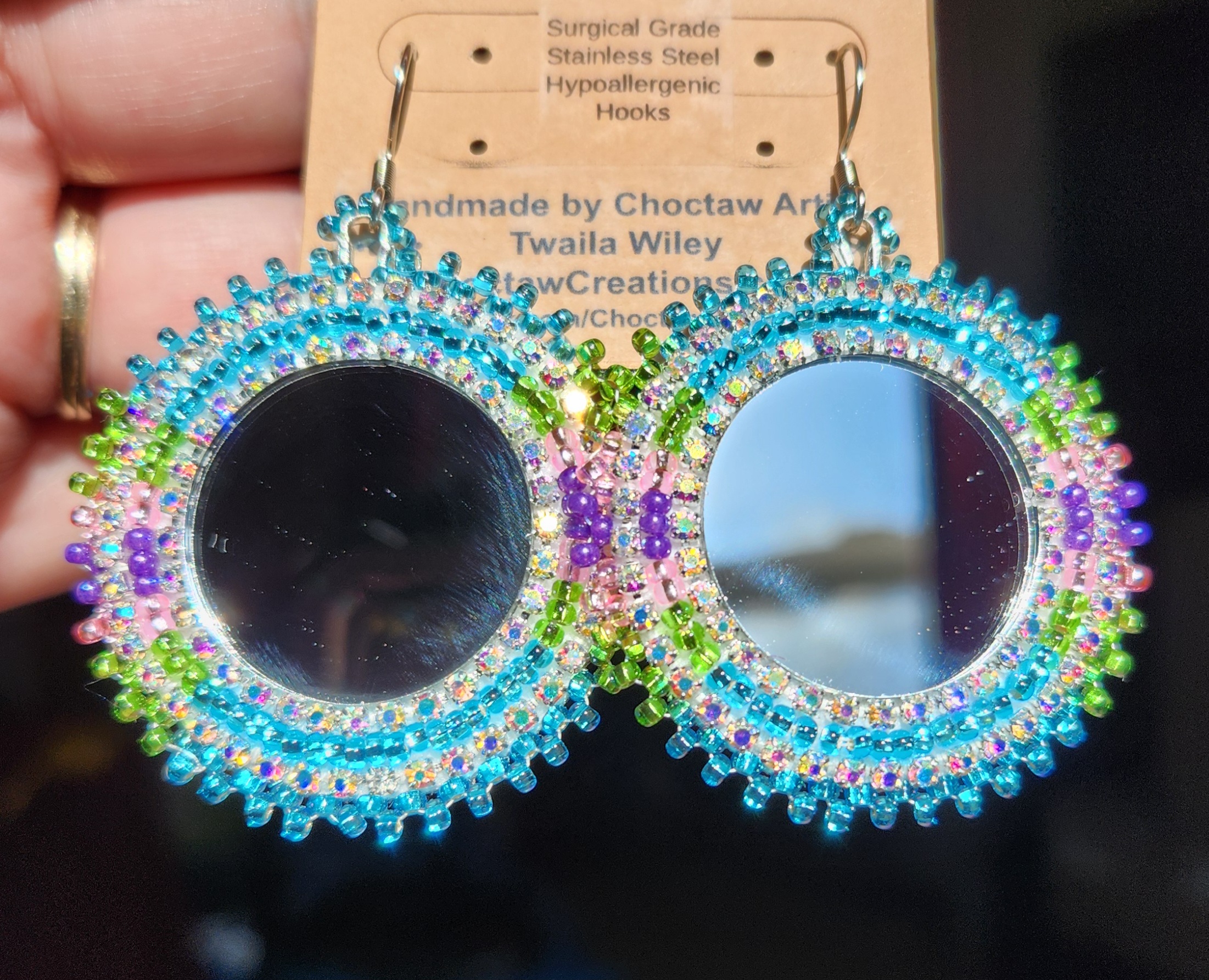 Handcrafted Mirrored Beaded Earrings. Backed with buckskin. About 1 3/4 inch in diameter. Email for custom colors!